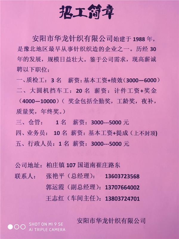安陽(yáng)市華龍針織有限公司招聘